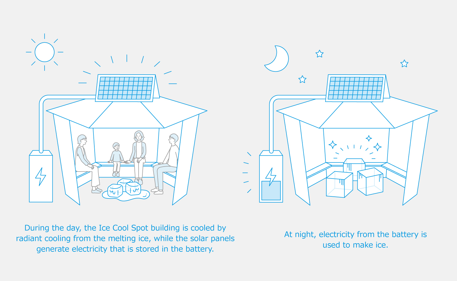 Measuring 8.7m in diameter and 3.7m in height, “Ice Cool Spot” is a wooden building equipped with benches that can accommodate around 30 people. Electricity generated during the day is stored in a storage battery, and that same energy is used at night to create the ice contained in 10 ice panels embedded in the walls of the building. Heat from the melting ice (radiant heat) is used the next day to cool Ice Cool Spot. This is a new air environment solution that combines the ice thermal storage technology that Daikin has developed for its air conditioners with solar power generation.