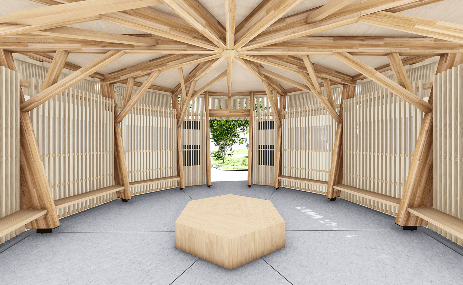 For the first design element of being constructed from wood, I thought that it would be important to “prominently highlight the vitality and beauty of wood.” Because of its relatively small size, much of the building will be within the field of vision of visitors, so we labored in how to best present the beauty of wood. What we were the most insistent about were the placement of the king post *1on the center beam in the center of the building and the mortise and tenon joinery, which utilize ancient Japanese building methods. The knee braces were also constructed in a shape to represent tree branches and shade.