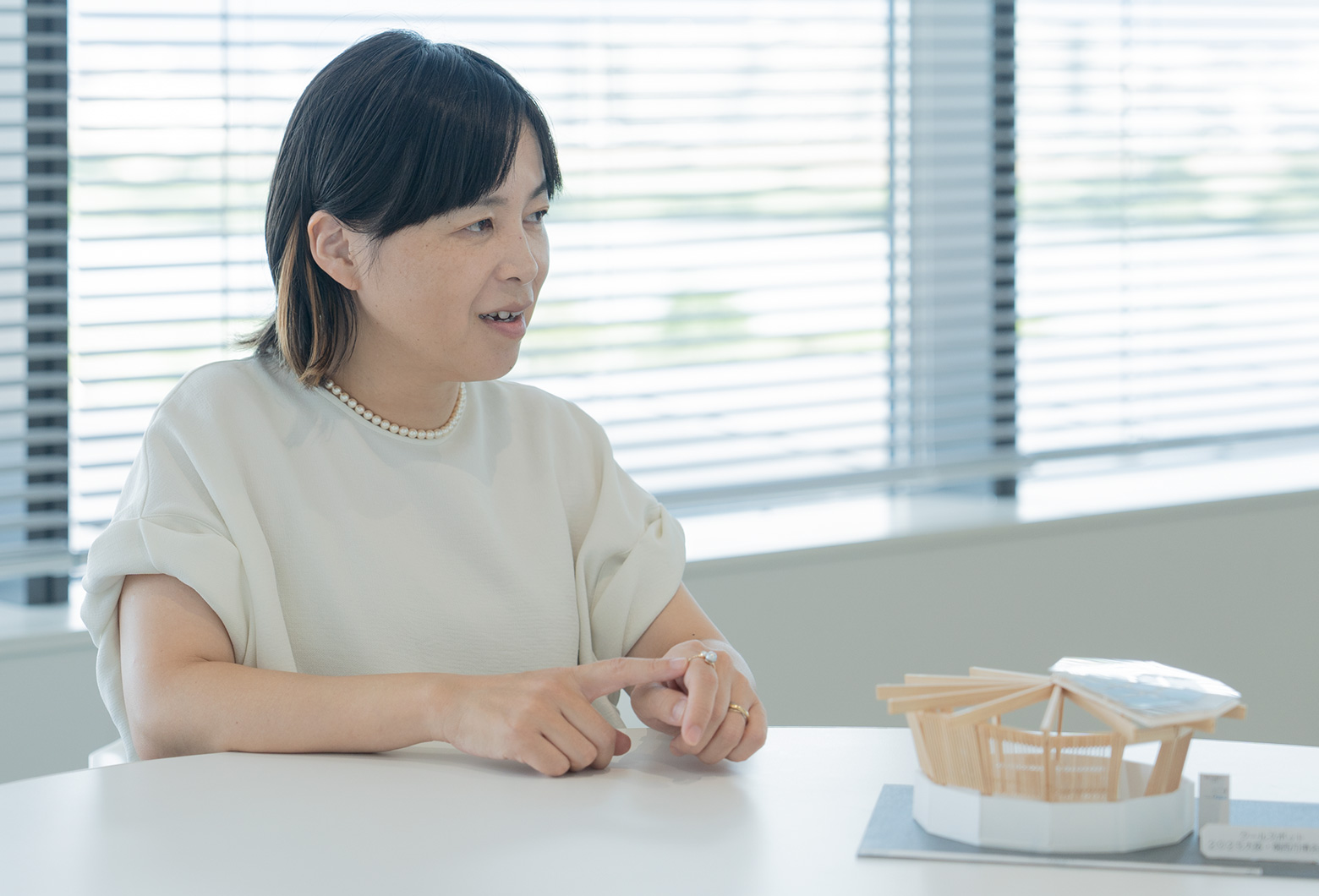 Strolling through the venue, signboards blend in with the paths, and the foliage entices you to enter. Once inside, a gentle fragrance greets you, and you can sit on a bench and see the beautiful beams as you look up at the ceiling. Feeling the outside air penetrating the lattice spacing, you begin to appreciate the design for its comfortable air conditioning. In this way, I hope that everyone will gain a sense of Daikin through this series of experiences.