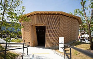 The air conditioning of this outdoor rest area offers radiant cooling that combines ice thermal storage and solar power generation. Rather than cooling the entire space, ice panels utilize the ice produced at night to directly cool people during the day through radiant cooling, spawning an environment for next-generation air conditioning. Not relying on airtightness, the floor was designed to be lower than ground level and incorporates various measures in storing cool air in an open structure connected to the outdoors. Fully utilizing technologies cultivated by the long-established air conditioning manufacturer, the structure uses the wood lattice installed to the exterior and interior walls for ventilation and lighting to achieve a design that receives high praise for both functionality and beauty.