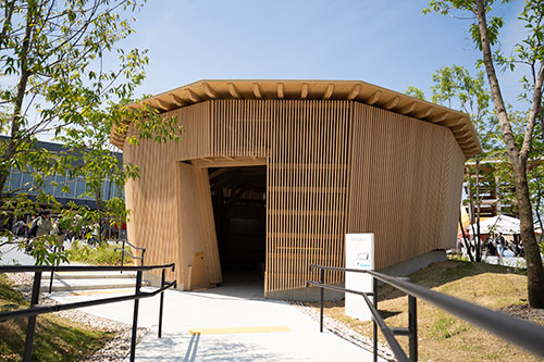 Utilizing natural energy, this rest area was installed at Expo 2025 Osaka, Kansai, Japan as a relief measure from the summer heat and drew inspiration from traditional icehouses that stored ice and snow. It applies ice thermal storage air conditioning*2 technology to provide a naturally cooled environment. Some of the electricity generated by its solar panels is used to produce the ice needed for radiant cooling*3 and deliver the same comfort and cool sensation of an icehouse. Traditional Japanese wood lattice is used for the interior and exterior walls in an open structure allowing sunlight inside while keeping outside air from entering. The wood lattice building and green solar panels create an exterior design that exquisitely harmonizes with its surroundings.